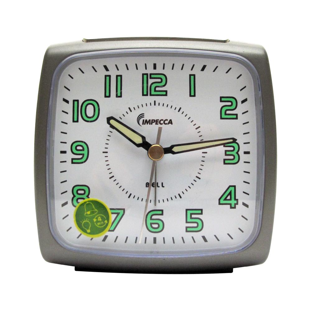 The Impecca Bell Alarm Clock in metallic grey blends understated style with reliable timekeeping. Its clean white dial with bold green numbers ensures easy readability, while luminous hands make it useful even in low light. Compact and durable, this versatile clock is a practical addition to any bedside or desk.