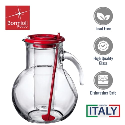 Bormioli Rocco Kufra 72.75 Oz. Glass Pitcher with Red Lid, Spout and Ice Tube, Water Pitcher for Fridge, Glass Carafe for Water, Iced Tea Pitcher, Juice, Homemade Beverage And Party Cocktails.