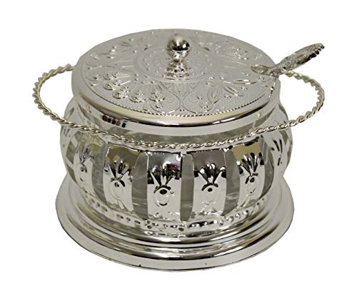 Add elegance to your table with the Majestic Giftware Decorative Silver-Plated Glass Honey & Candy Dish. Measuring 3 inches high, this beautifully crafted piece combines sparkling glass with intricate silver-plated detailing for a refined and timeless look. It includes a matching lid and spoon, making it ideal for serving honey, candies, or sweet treats during holidays, Shabbat, or special occasions.