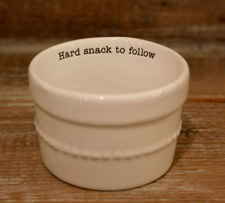 This individual, playful Ceramic Ramekin is a fun and stylish piece for serving. The single white ceramic ramekin features the humorous black sentiment, "Hard snack to follow," printed inside the rim. The exterior is accented with a decorative beaded band texture. Perfectly sized for condiments, dips, nuts, or individual desserts, this charming and functional ramekin is an essential addition to your serveware collection.