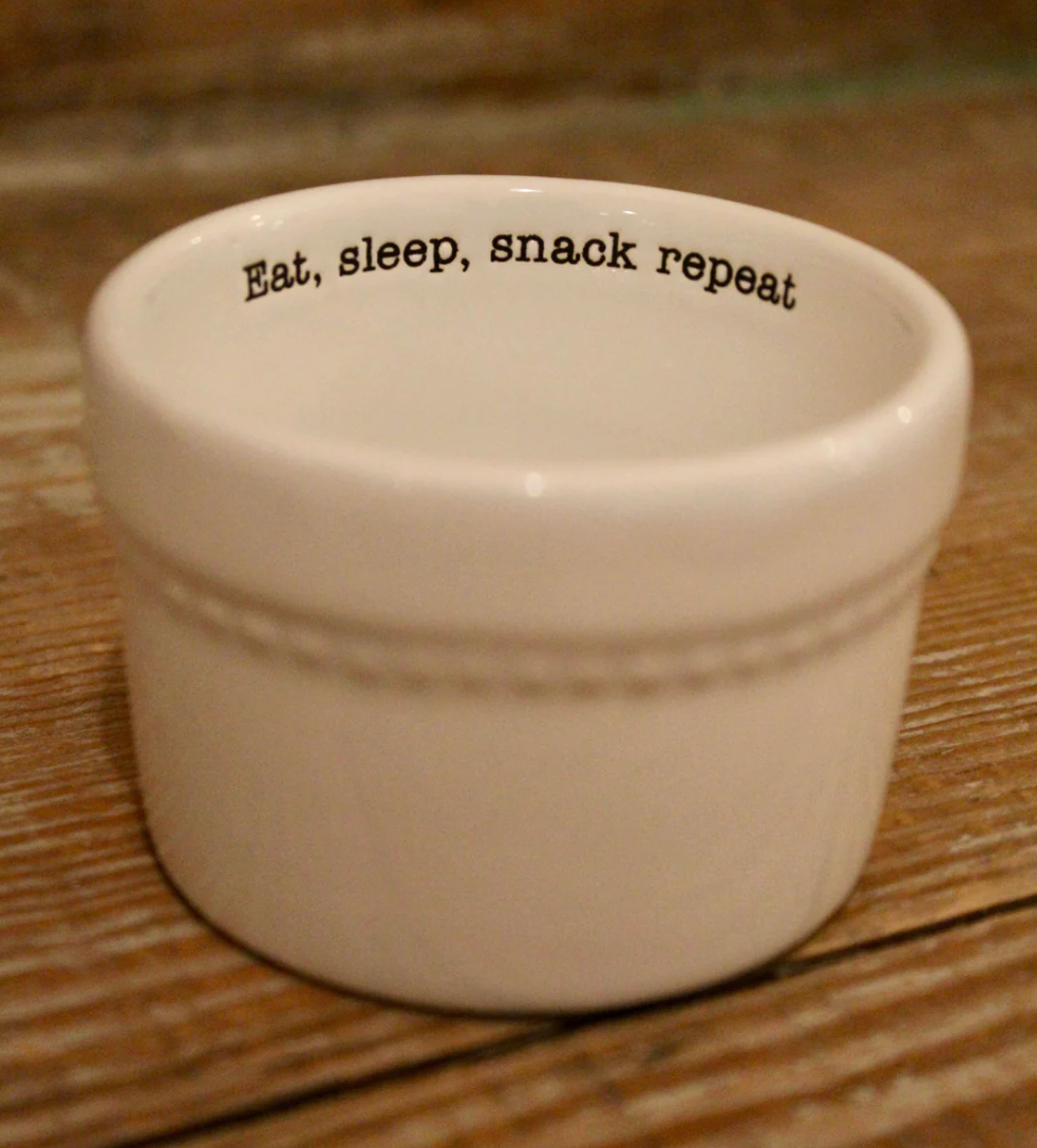 This playful Ceramic Ramekin is a fun and functional piece perfect for hosting and sharing your favorite snacks or treats. This individual white ceramic ramekin features the humorous black sentiment, "Eat, sleep, snack repeat," printed inside the rim. The exterior has a subtle, decorative stitched texture. Perfectly sized for condiments, dips, nuts, or individual desserts, this charming ramekin is an essential and witty addition to your serveware collection.