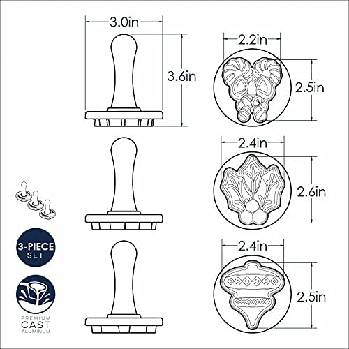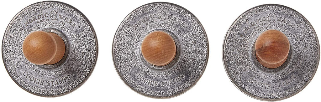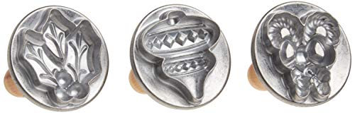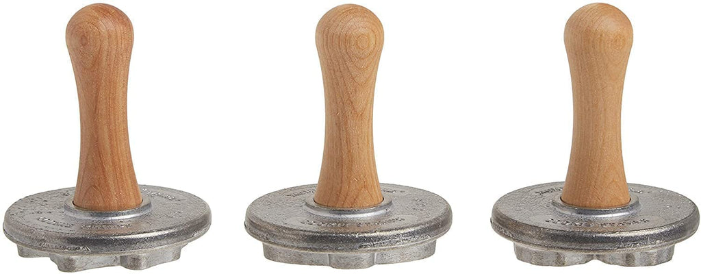 An exciting development in our collection! Our stamped cookies have always been round, but these cut-outs add three distinct cookie cutter shapes to the 3-D embossing everyone's come to love. Stamp and cut Holly sprigs, candy canes and traditional "blown glass" Ornaments in a single motion! Blonde hardwood handles provide mid-centry appeal.