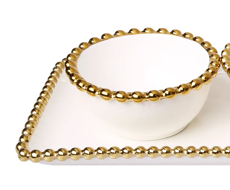 Enhance your table presentation with this elegant White Porcelain 3-Bowl Relish Dish, accented with a refined gold beaded design. Featuring three petite bowls seamlessly arranged on a single tray, this piece is ideal for serving dips, sauces, condiments, or small appetizers. The crisp white porcelain pairs beautifully with the metallic gold detailing, making it suitable for both festive gatherings and intimate family meals. With its tasteful design and practical size, it effortlessly combines form and function.