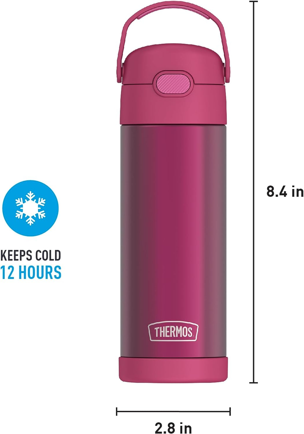 The FUNtainer 16-ounce Vacuum Insulated Stainless Steel Water Bottle with Spout keeps drinks cold for up to 12 hours. Our kids water bottles are built so their drinks are as cool on the inside as they look on the outside. Kids stay hydrated and parents stay happy. The double wall stainless steel construction is built to handle drops, dings and assorted roughhousing. Includes an integrated carry handle with soft-touch grip, making it easy for kids to carry with them throughout the day. Help keep germs away with the hygienically covered drinking spout. To clean, you can pop your FUNtainer water bottle in the dishwasher; however washing by hand is recommended. Not for use with hot liquids.