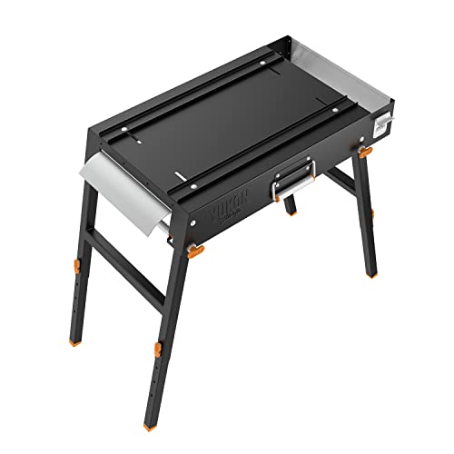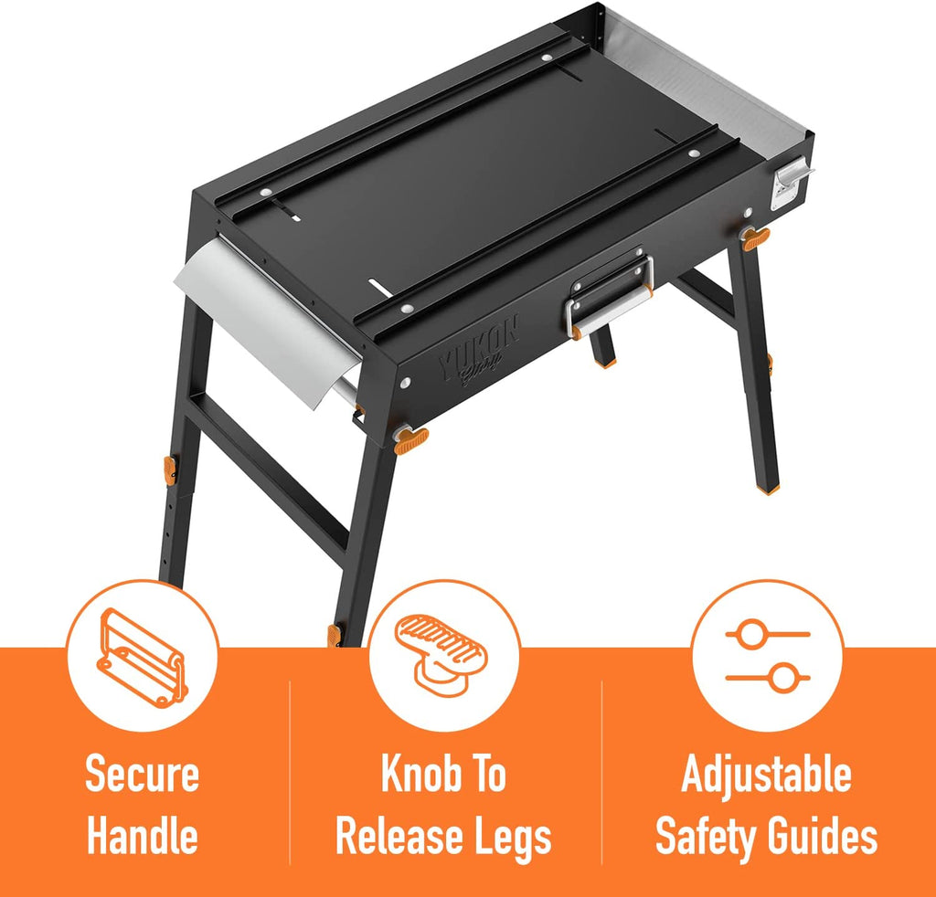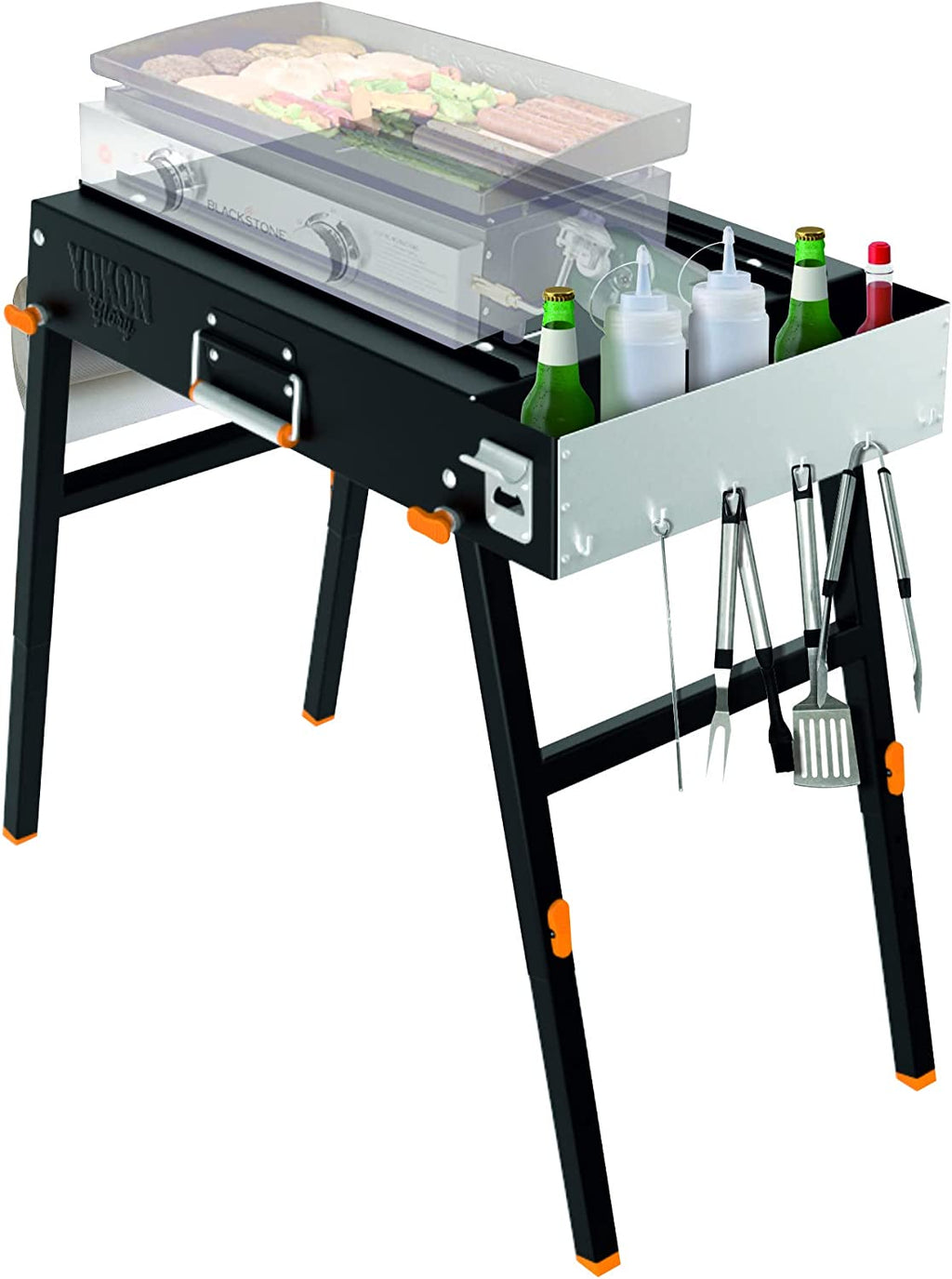 ULTIMATE GRILL STAND - Take your grilling table to the next level - this beauty has everything you need to griddle like a pro, including a cigar holder - bottle opener - paper towel holder - griddle caddy - hooks to hang all your grilling accessories - & a handle to transport with ease UNIVERSAL DESIGN - The Yukon Glory universal griddle stand was created with you in mind, the adjustable safety guides, allow you to use multiple different size grills and griddles - including the 17" propane griddle and the 22" Blackstone griddle ADJUSTABLE LEGS - The table top griddle stand was conveniently designed with legs that adjust from 22" all the way up to 30" so you can easily choose the height that works best for your outdoor grill table. NOTE - T-Handle will not fully engage until legs are extended PORTABLE GRILL TABLE - Easily fold up the griddle table, grab the handle and go, whether you're traveling and camping or simply moving it from your patio or yard - transport your grilling stand with ease PREMIUM QUALITY - The Yukon Glory grill stand is made from high quality material including strong and durable stainless steel - enjoy your upgraded griddle space, without having to worry about rust or corrosion for years to come.